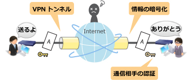 VPNとは、Virtual Private Networkの略で、インターネットに接続している利用者の間に、仮想的な通信トンネルを構成した